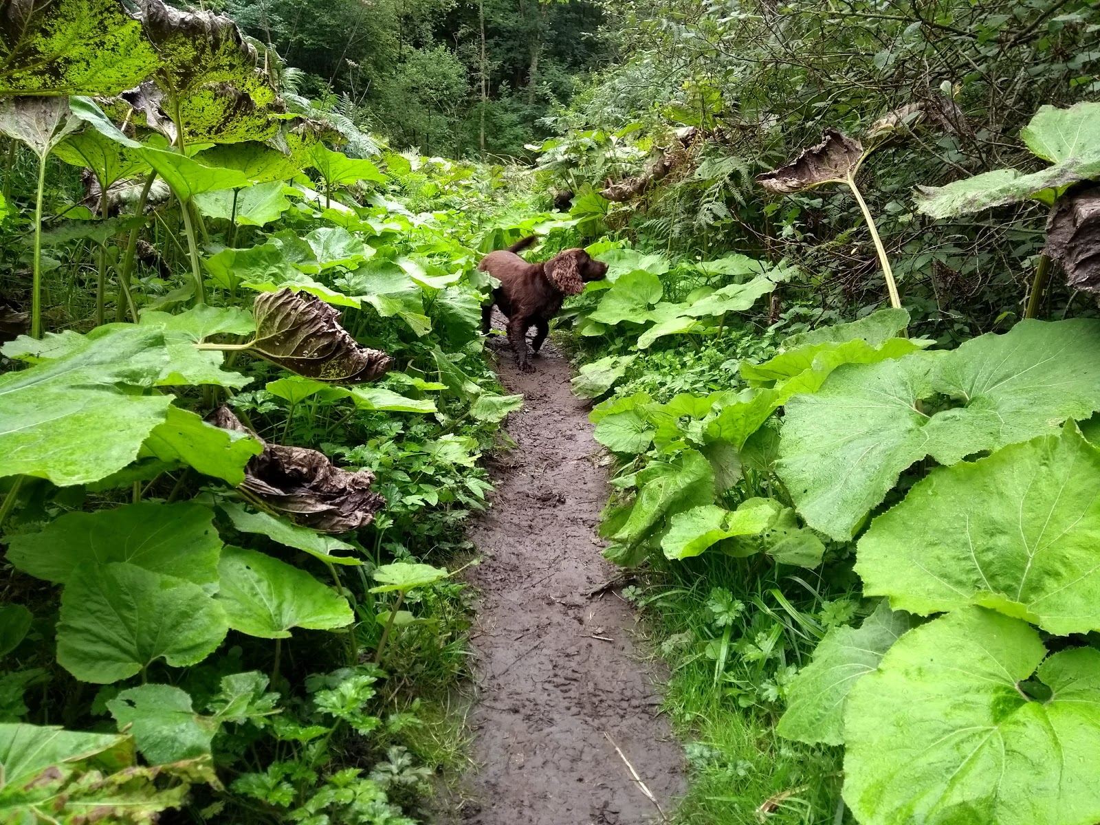 Lots of these giant Rhubarb type plants. A spaniel is included for scale.